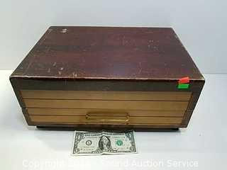 Lift top and single drawer. Approx. 7" tall, 15.5" wide and 11" deep.