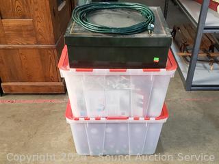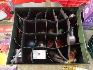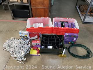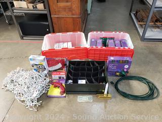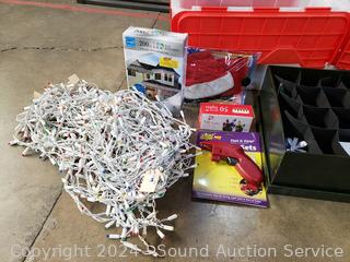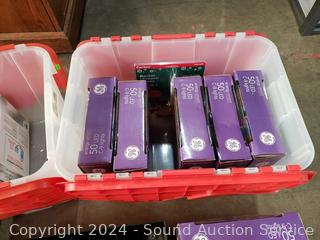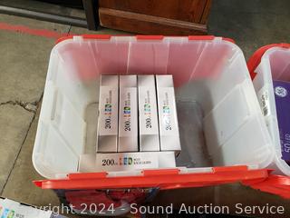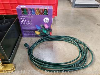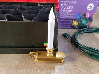 (6) 50 LED C-9 Light Bulbs, box of ornaments, extension cord, 5 boxes of 200 LED string lights, some loose Lights. All untested, as is. 12" H x 21.5" x 15".