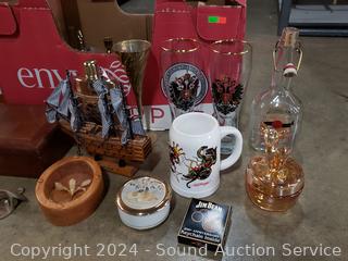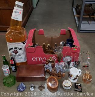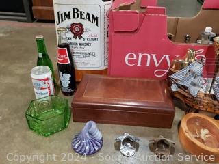 Wood model ship, Jim Beam inflatable, coasters, flask, mugs, Coca-Cola bottle openers, jewelry box, wood bowl & more. Refer to photos for more details.