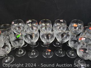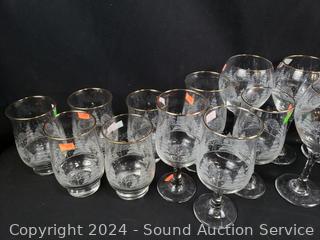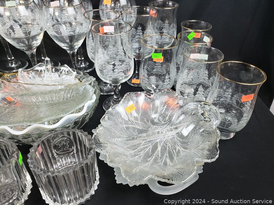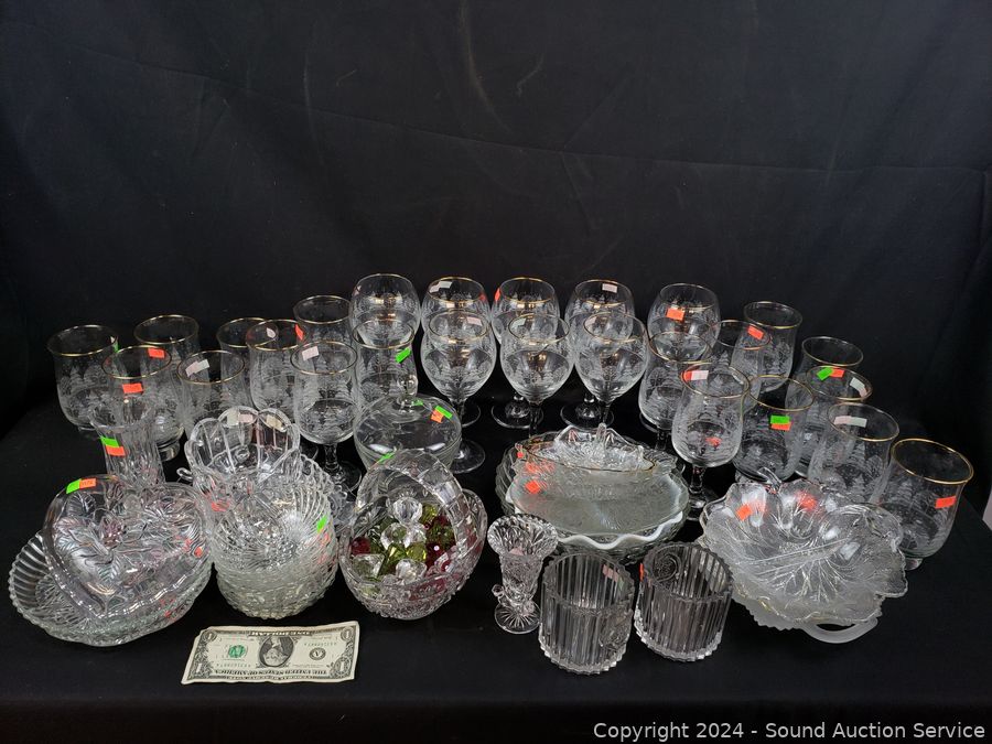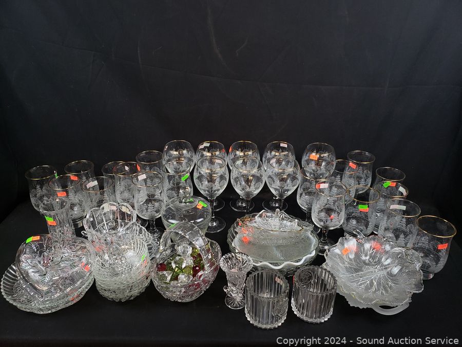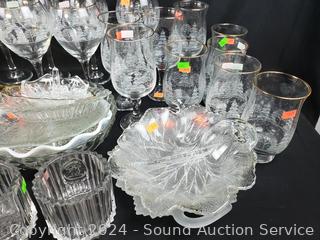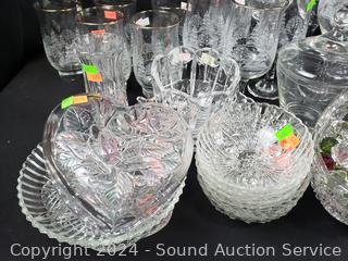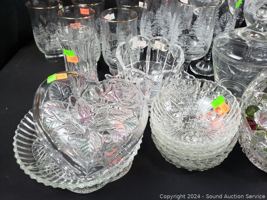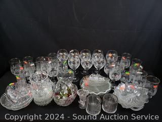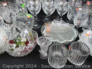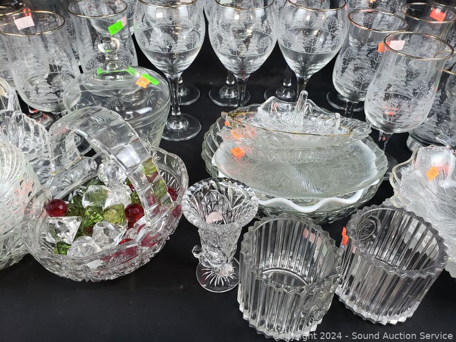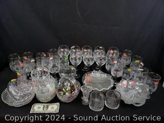 Wine glasses, tumblers, handled basket with acrylic prisms, highball glasses, covered dishes, bowls, candy dishes, vases, etc. Refer to photos for more details.