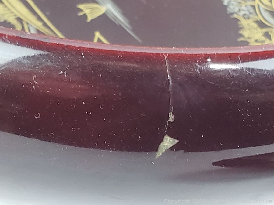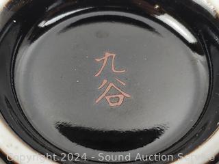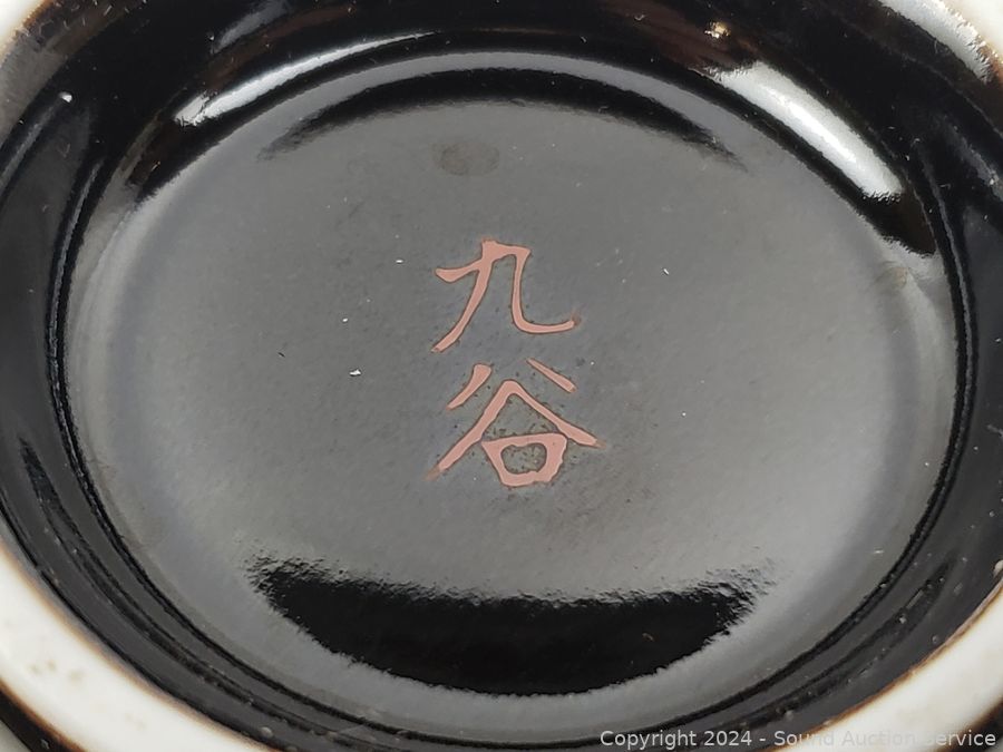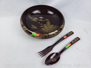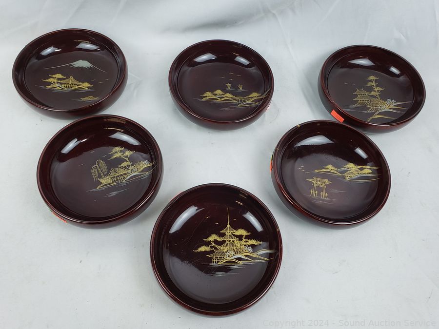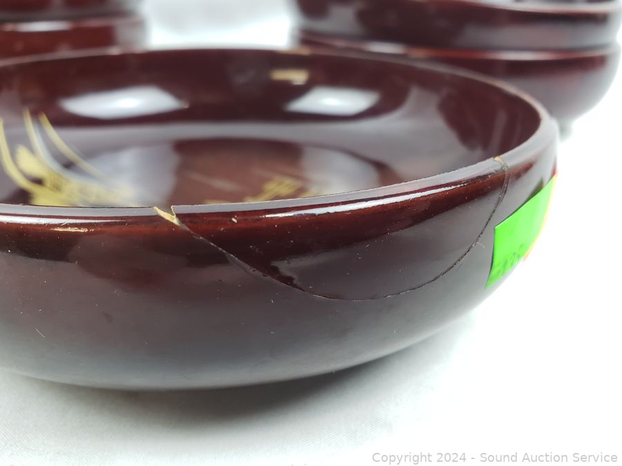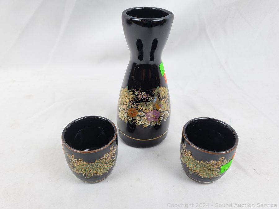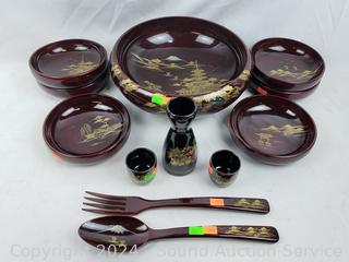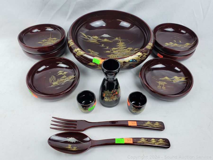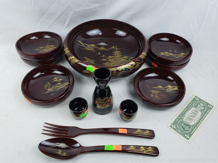 Hand painted in gold, one small bowl has a repaired chip, utensils, sake decanter, 2 cups. Refer to photos for more details.