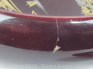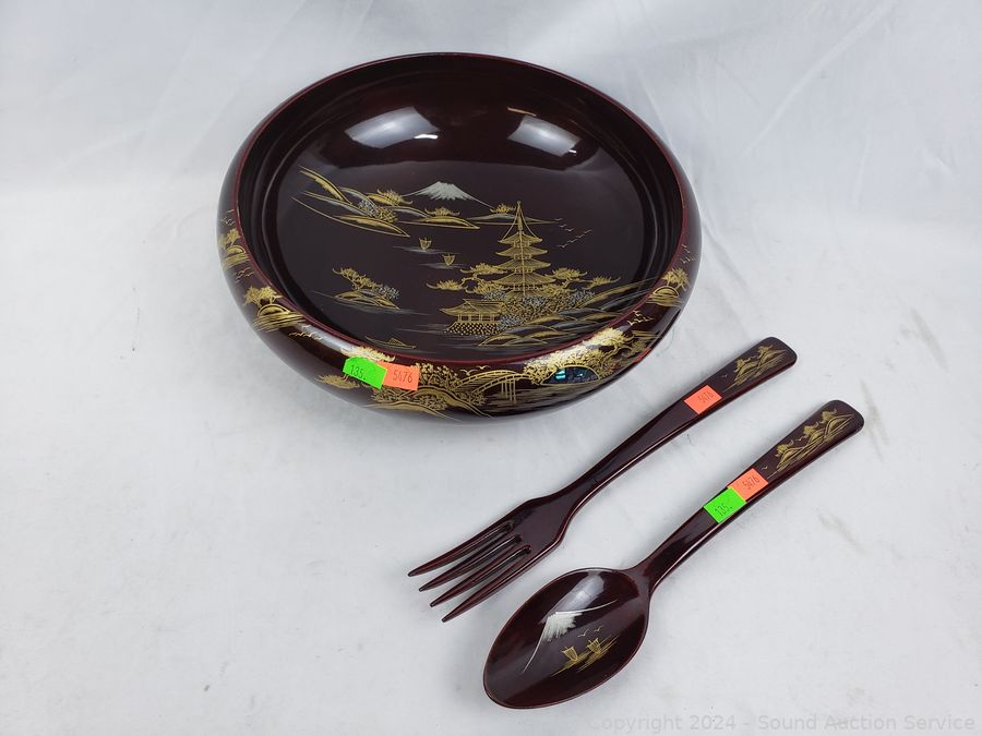 Lot #0135: Hand Painted Wood Salad Bowl Set w/Sake & Cups