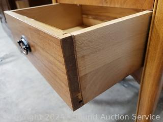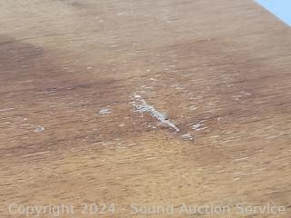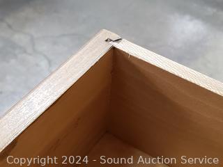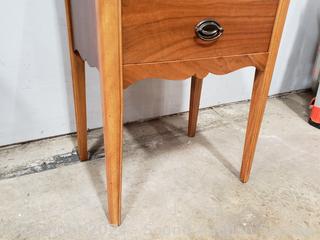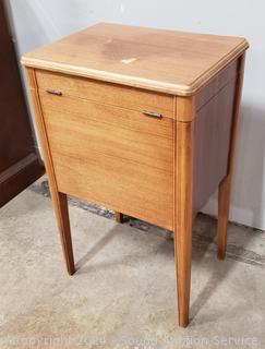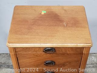All wood construction, veneer is peeling on the top, otherwise in great condition. 26.5" H x 16" W x 12" D.