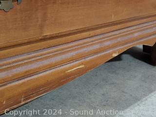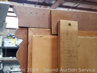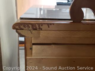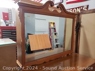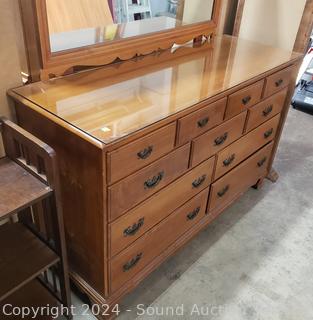 Appears to be solid wood construction, dovetail joinery. A few minor scuffs, overall great condition. Comes with protective glass for the top. 35" H x 56" W x 20" D with 40.5" H x 45" W mirror. Matches the previous lot.