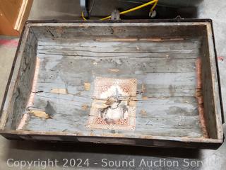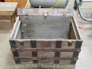14" H x 31" W x 15" D chest & 24" H x 31.5" W x 20" trunk. Various wear from age, use. Trunk is missing handles, hinges on trunk are broken.