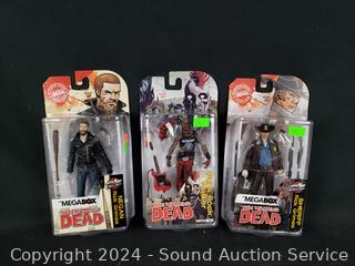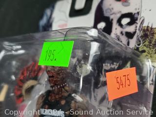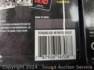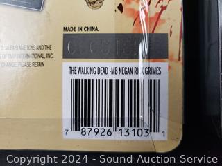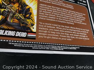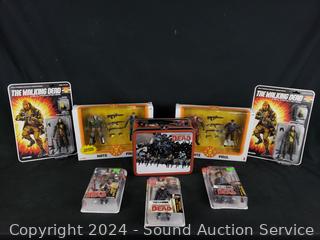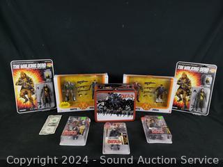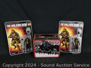 Lot #0195: 5 The Walking Dead Action Figures, Lunch Pail & 2 Die Figures