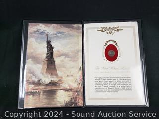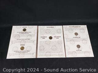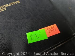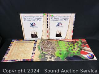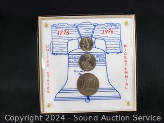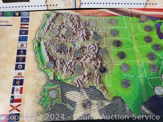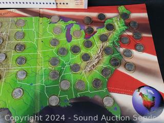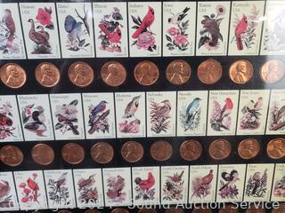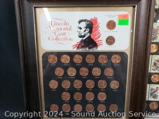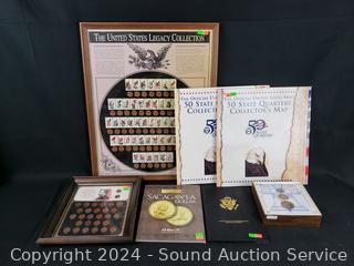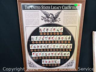 Framed Lincoln Memorial Cent Collection 12" x 10", Framed United States Legacy Collection 21" x 17", 3pc 1776-1976 United States Bicentennial coin set in slab, Silver Winged Liberty Dime Album, Sacagawea Dollar Millenium Dollar Album (missing 2 coins), 2 Official United States Mint 50 State Quarter Collection Albums (1 is full, other is empty).
