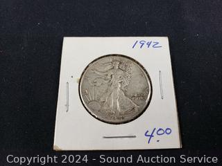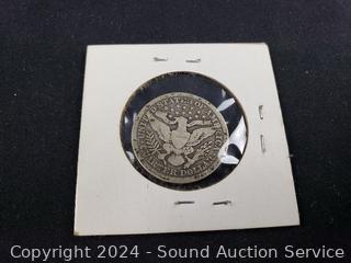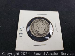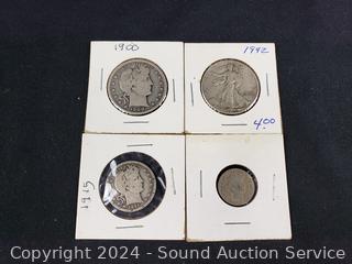 1910 Silver Barber Dime, 1915 Silver Barber Quarter, 1900 Silver Barber Half Dollar, 1942 Walking Liberty Eagle Half Dollar. ATTN: We are not coin or currency experts or graders, please use your own judgement when bidding.