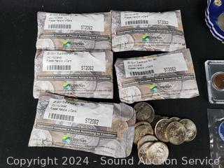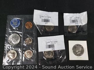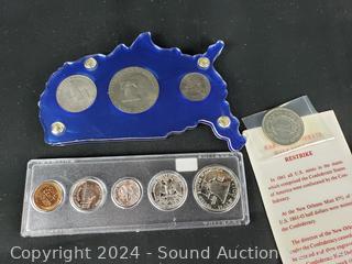 5ct (4 sealed, 1 opened) 25ct Statehood Quarter sets, 1776-1976 Bicentennial Coin Set in slab, Rare 1861 Confederate Half Dollar Restrike, 1954 Silver US Proof Set, 1965 Special Mint Proof Set & other coins. ATTN: We are not coin or currency experts or graders, please use your own judgement when bidding.