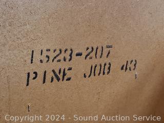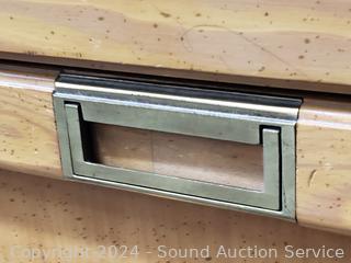 Wood fronts, brass hardware. 30.5" H x 42" W x 18" D. Don't see any issues. Matches the next lot.