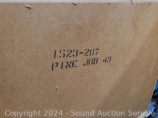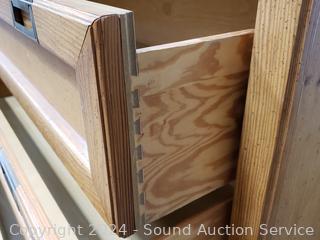 Wood fronts, brass hardware. 30.5" H x 42" W x 18" D. Don't see any issues. Matches the previous lot.