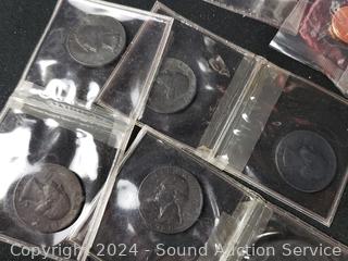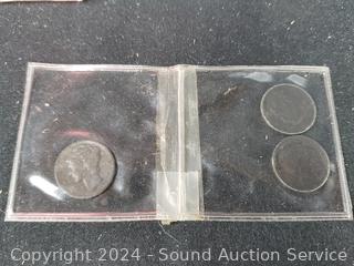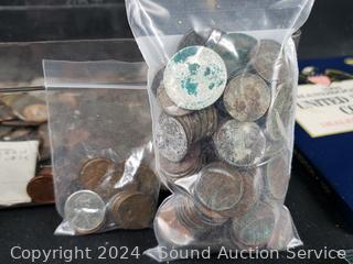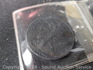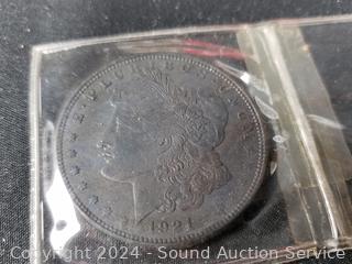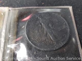 1921 Morgan silver dollar, 1943 & 1944 walking liberty half dollars, various pennies, many are tarnished, dirty, etc. Refer to photos for more details.