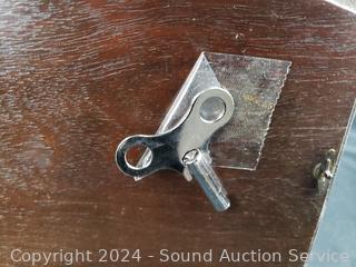 Runs for a few mins then stops, needs serviced. Comes with key & pendulum. Don't see a brand. Approx. 9" H x 17" W x 6.5" D. Some crazing, olde patina from age, use.