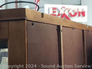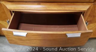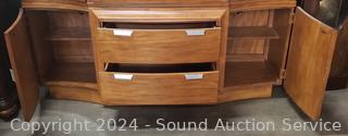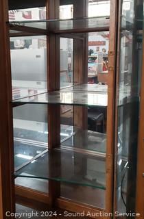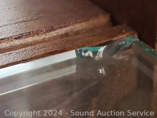 Glass shelves with plate grooves. Right side middle shelf is chipped. Some minor scuffs. Center door has beveled glass. Top drawer is felt lined. 80.5" H x 67" W x 19" D. Made in Chaina. Appears to be all wood construction.
