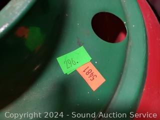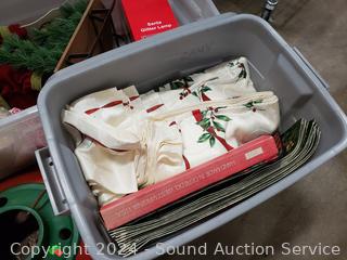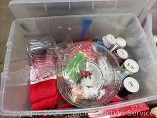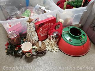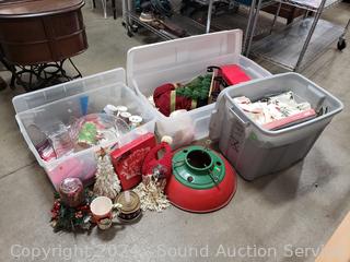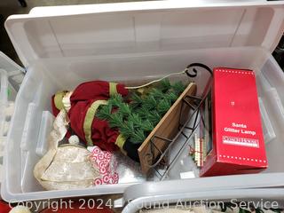 Tree base, dishes/tableware, linens, placemats, Santa w/Sleigh, glitter lamp, other decor. Refer to photos for me details. 12" to 16" H x 15" to 33" W/L totes.