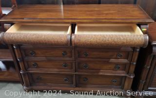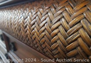 Woven section is a felt lined drawers, 8 other drawers. Solid wood construction, dovetail joinery. A few minor scuffs, overall great condition. Matches the previous & next few lots. 45" H 58" W x 18" D. Consignor said it was purchased in Indonesia.