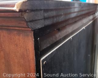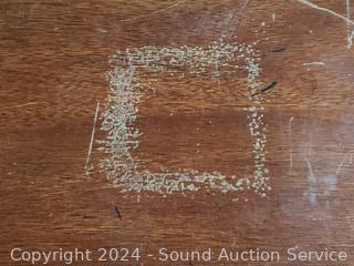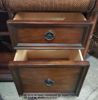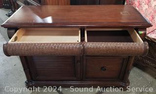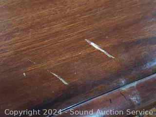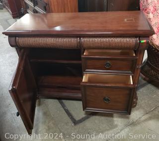 Drop front keyboard drawer, felt lined drawer, pullout printer shelf, file drawer. Some scuffs, wear to finish, overall good condition. Matches the previous few lots. 36" H x 50" W x 19" D. Consignor said it was purchased in Indonesia.