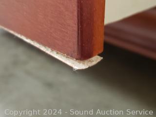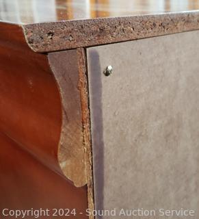 2 hidden felt lined jewelry drawers in the top. Particle board construction, wood fronts, veneer. Some minor scuffs on edge. 35.25" H x 64" W x 18.25" D.