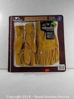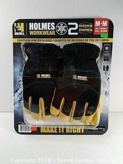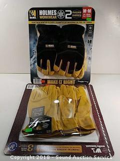 Includes: (2) pairs Holmes Workwear leather work gloves and (3) pairs Wells Lamont leather work gloves. All are size medium. Refer to photos for more information.