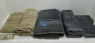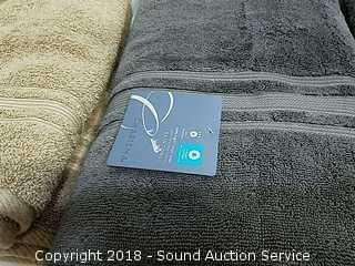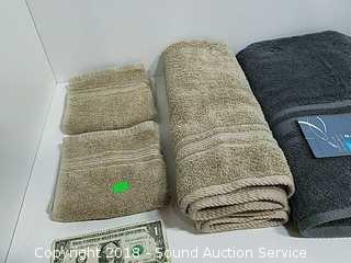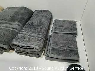 Includes: (1) bath towel, (4) hand towels and (4) washcloths. Grey and taupe color. Refer to photos for more information.
