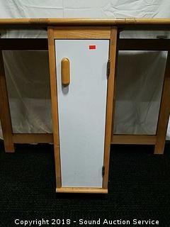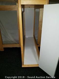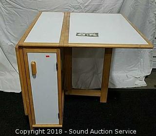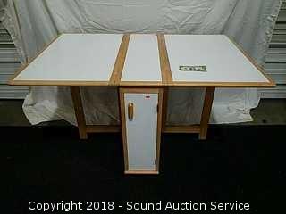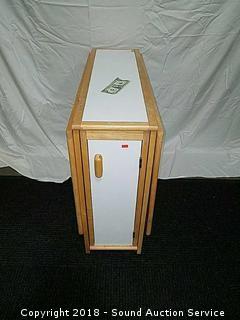 Narrow for easy storage. Approx. 29.5" tall, 12" wide with leaves down. Opens up to 53.5" x 34". Has cabinet for storage.