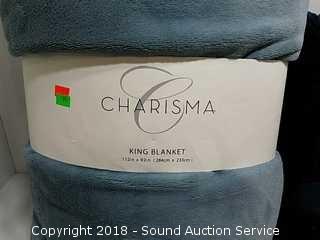 King blanket is by Charisma, approx. 112" x 92". Throw is 60" x 80". Refer to photos for more information.