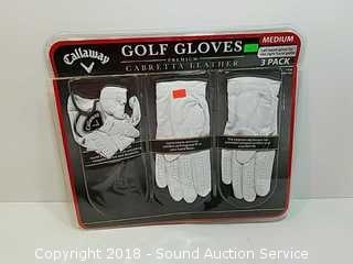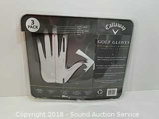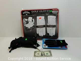 Includes: 2 pack medium Callaway golf gloves, medium cabretta leather conductive cold weather gloves, and youth's medium conductive cold weather gloves. Refer to photos for more information.
