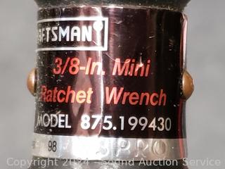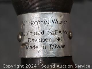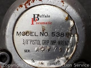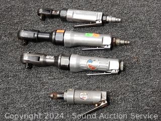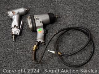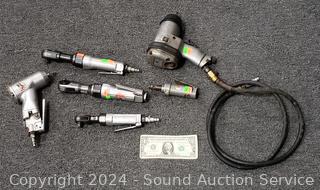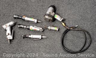 (3) 3/8" air ratchets (1) 3/8" impact driver, (1) 1/2 impact driver, (1) die grinder. All work, signs of wear from use. 2 missing hose fittings.