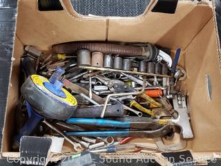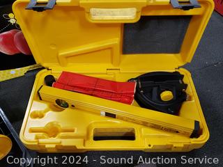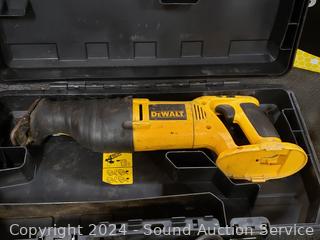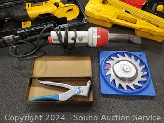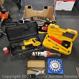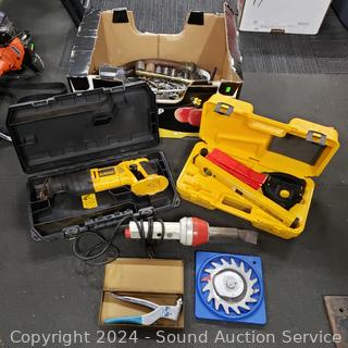DeWalt 18V Reciprocating Saw (no battery or charger), dado blade, drum auger, laser level (batteries are stuck inside), sockets, wrenches, etc. Refer to photos for more details.
