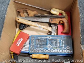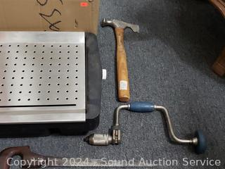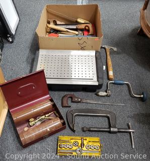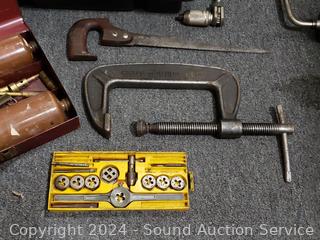 8" "C" clamp, auger drill brace, tap & dies, hand saws, roofing hatchets/hammers etc. Refer to photos for more details.