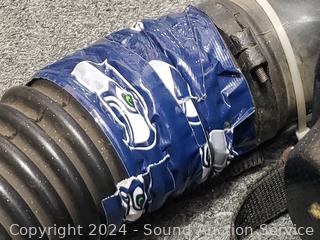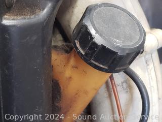 Won't start, has compression, leaks gas at primer bottom, missing air filter cover, hose is torn, fixed with duct tape. Various wear to finish.
