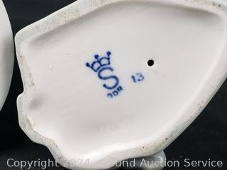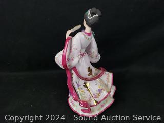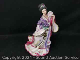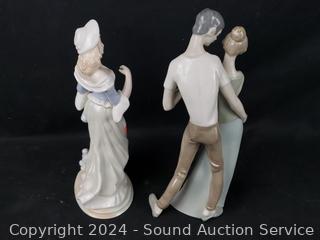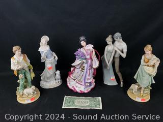 2 Lladro Style, 1 with German GDR S Crown makers mark, other embossed Conte Original. 2 Ethan Allen boy and girl with lambs & Danbury Mint "Iris Princess". Approx. 9" to 10.5" tall. Don't see any issues.