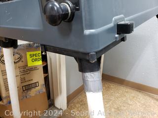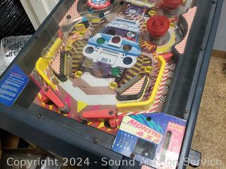 Missing power supply, untested. Ball plunger & paddles are working. Legs have been replaced with PVC pipe. Approx. 48" H x 36" L x 18" W.