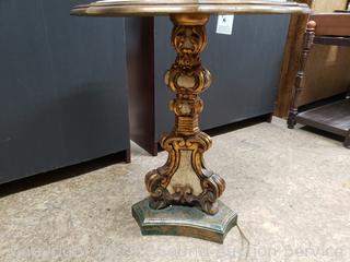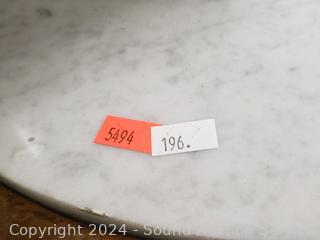 57" H x 18" Dia. marble top table. Some scuffs, wear to finish, distressed finish. Appears to be functioning as intended.