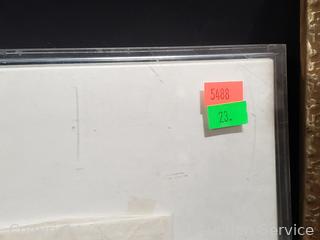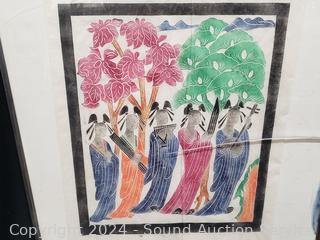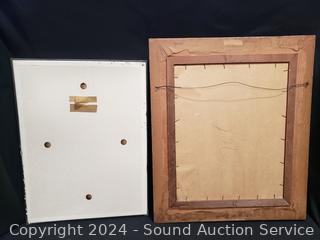 28" x 23.5" & 24.5" x 18.5". Acrylic frame of block print has some cracks.
