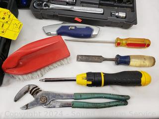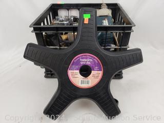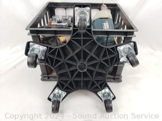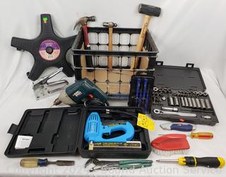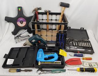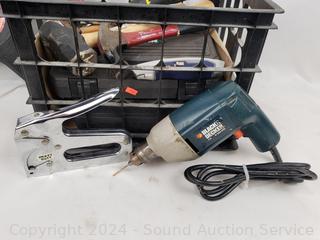 Plant caddy, Black & Decker 3/8" drill, Arrow elec. stapler, Allen socket set w/Craftsman wrench, mallet, hammer, hand tools, etc. Refer to photos for more details.
