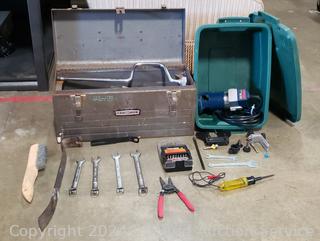 Trimmer works, comes with small Rubbermaid tote with lid, 7" H x 14.25" x 10.5". Toolbox has wire brush, socket extensions, drill bits, nut drivers, wrenches, etc. Refer to photos for more details.