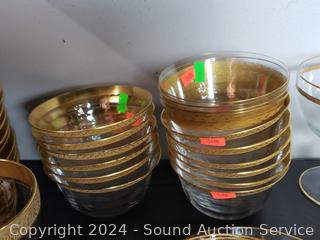 51ct of several types of glasses, 3 styles 17ct 4.75" bowls, 16ct 8.25" plates. Various wear to gold finish.
