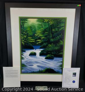 Estimated list price $12,448. Consignor had this custom framed, unable to see the signature, or number, it is under the matting. Limited Edition Serigraph on heavy artist paper, hand AP numbered & signed by artist. Jon Rattenbury is an artist, visionary, and innovator. His work is characterized by meticulous attention to detail, vibrant colors, and a captivating portrayal of nature’s beauty. Rattenbury’s passion for the natural world shines through in every dreamlike piece of art he creates. "Evergreen Stream" This luminous landscape captures light and shadow with impeccable detail, showcasing Rattenbury’s talent for vibrant colors and intricate scenes. Overall 41.5" x 32.5", image 20.5" x 27.5". Refer to photos for more details. Comes with CoA & artist information.