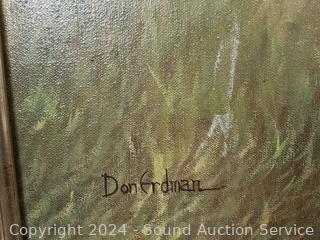 Don Erdman is an American artist known for his painting of a Female Kudu. 29" x 41.5". Some minor scuffs on frame, overall good condition. Refer to photos for more details.