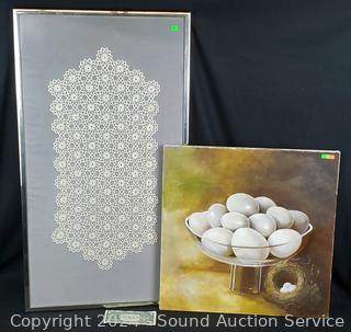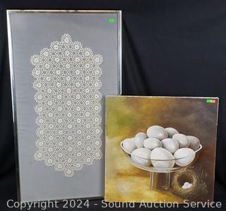 Lot #0115: Original Egg Oil Painting & Framed Crochet Textile