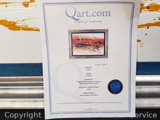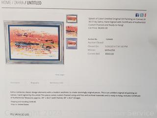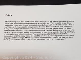 Comes with CoA & purchase receipt from Qart.com where consignor had purchased in an auction. Qart had the Estimated list price $8,800. Overall 36" x 49". After studying in Asian and Europe, Zahra emerged as the premiere Asian artist of the generation that followed the likes of Dove and Kandinsky. With an ability to combine nature and imagination in one exquisite image. Zahra works meets at the intersection of architecture, feelings, spatial analysis, and dreams. Zahra's works can be found in both public & private collections around the world and she has exhibited her works internationally as well.