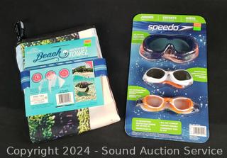 Lot #0250: 3pk Speedo Junior Swim Googles & Whitley Willows Microfiber Beach Towel