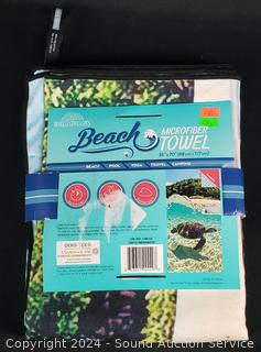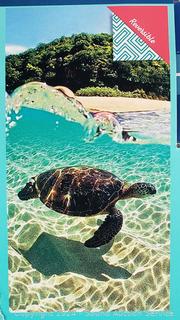 Turtle print beach towel, 35" x 70". Swim goggles are sealed. Don't see any issues.