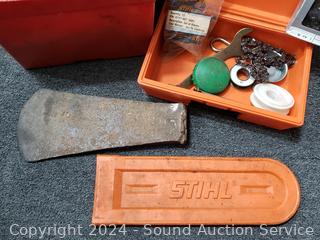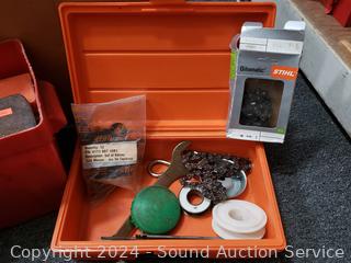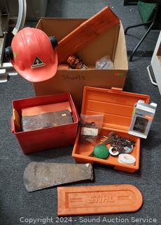 Wedges, chainsaw chains, hard hat, chain guards, etc. Refer to photos for more details.