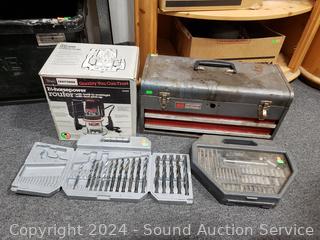Toolbox has some sockets & other tools. Router comes with original box. All Trade bit & Tool Sets, both missing some pieces. Refer to photos for more details. All with wear from use.