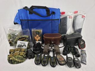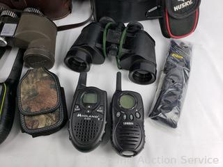 Lot #0098:     Pistol Holsters, Binoculars w/Harnesses, 2-Way Radios