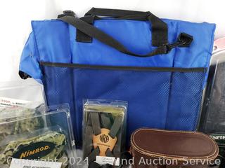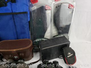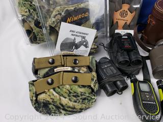Radios untested. Rugged Exposure 10x25 binoculars, Bushnell 7x35 binoculars, JC Penney 7x35 binoculars, 3 Leupold binocular harnesses, 2 Uncle Mikes pistol holsters.