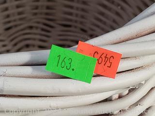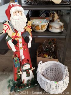 Wood Santa statuary, string lights, stake outlet, ornaments, Santa figure, white wicker basket, tree bag 11" H x 15" Dia.