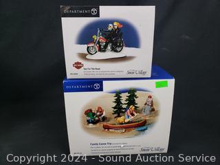 "Village Gazebo", "Family Canoe Trip", "Single Car Garage", "Village Accessories", "Woodland Lampposts" (works), "Two for the Road", "Candlerock Lighthouse Restaurant" (missing lamppost), "Hayride", "Single Car Garage", "Village Gazebo". All in original packaging.